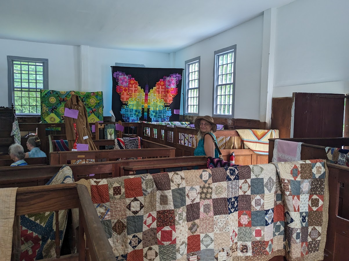 Our Timeless Textiles Exhibit will be held Saturday July 6th from 10 am– 3 pm and will feature displays, demonstrations and scheduled lectures. This year’s featured quilter is Michelle Plourde.  Michelle is an active member of the Belknap Mill Quilt Guild in Laconia. At 10:30 am she will speak informally and share her quilting story.  Not only will the day feature gorgeous textiles across the sheep pens in the Meeting House, but there will be hourly talks by visiting artists, demonstrations and Textile Historian, Stephanie Drake will lead a talk at noon on how to date quilts. Visitors are invited to bring textiles from home for Stephanie to comment on.  Textile artist Sara Goodman will speak inside the Meeting House at 11:15 about her wide-ranging work, including her weaving and her use of Shibori resist-dye techniques.  At 1:30 pm, she will conduct a demonstration outside on dyeing with indigo.  Sara is the lead dye studio instructor at Sanborn Mills Farm in Loudon, NH.  She also maintains a studio in Center Harbor on Squam Lake.